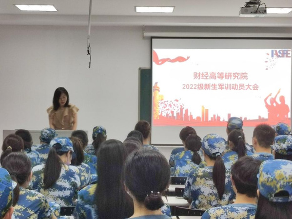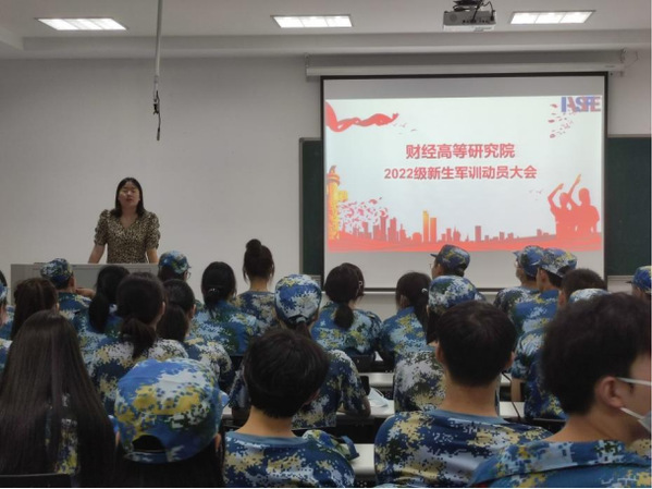 开展大学生军训是提高学生国家安全意识,学习军人优良传统作风,锻炼学生吃苦耐劳、奋力拼搏精神的有效途径,是学校加强思想政治教育,提高学生综合素质的第一课。为了做好2022年新生军训工作,九月十一号晚上六点半在法商综合楼505召开2022级新生军训动员大会,会议参与人员为财经高等研究院副院长潘娜,空军预警学院军官余自立,辅导员梅添淇以及全体大一新生。