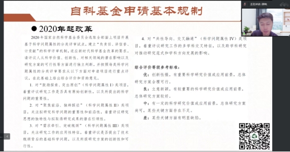 邵帅教授围绕评审规则、申请书撰写技巧以及评估的标准三个方面分享了国家自然科学基金的申请经验。邵教授指出研究方向的选择要针对中国国情,与国际接轨,并且结合自己基础,突出研究特色,稳定持续方向。研究内容要语言精练、切中要害,不说平庸之语,突出重点观点,给出数据来源。