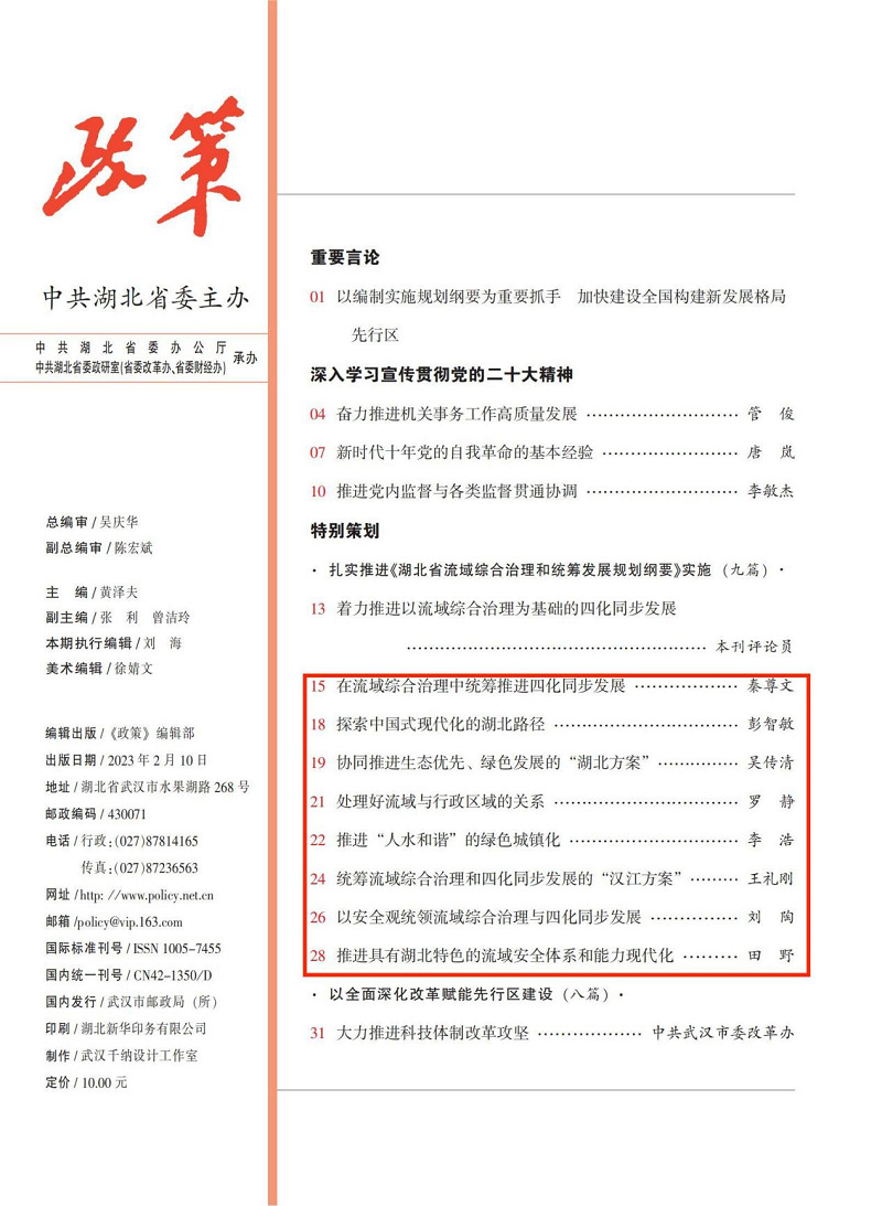 1月29日,我省“新春第一会”聚焦全省加快建设全国构建新发展格局先行区,部署实施建设先行区的行动纲领——《湖北省流域综合治理和统筹发展规划纲要》。1月30日,为了积极响应省委、省政府号召,长江经济带高质量发展智库联盟联合长江头条邀请7位省内知名专家组织召开了专题研讨会,对《规划纲要》进行了深入学习、解读与研讨,并形成系列文章在长江头条“长江经济带高质量发展智库联盟传播矩阵”、长江网“长江经济带专栏”首次对外刊发。近日,此系列文章被湖北省委机关刊物《政策》2023年第2期专栏全文刊发。此专栏中的三篇作者均为我校教师,标志着我校长江经济带研究系列成果进入省委、省政府领导及各级地方政府的视野,并将对贯彻落实我省十二次党代会关于“以流域综合治理为基础的四化同步发展扎实推进”重要精神发挥理论支撑作用。