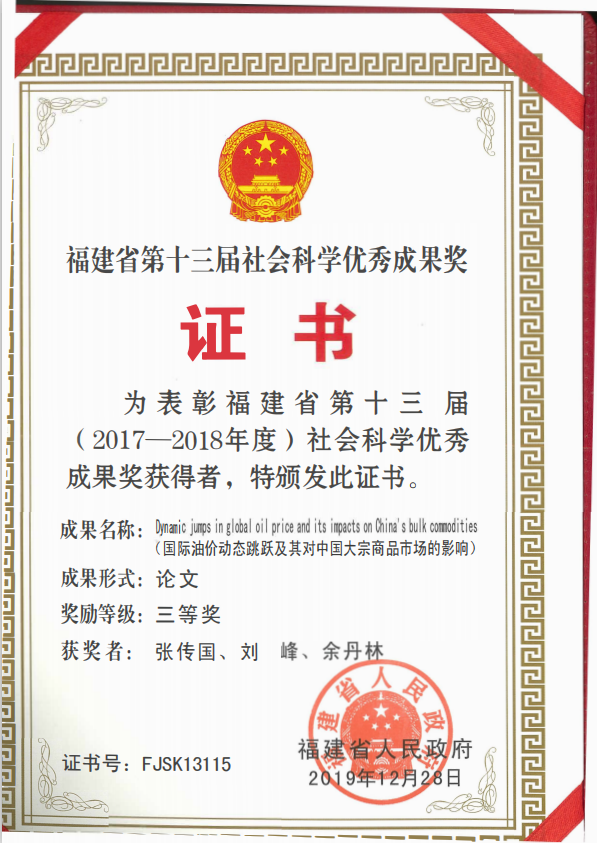 近日,我院青年教师刘峰博士及其合作者凭借论文“Dynamic jumps in global oil price and its impacts on China’s bulk commodities”获评福建省第十三届(2017-2018年度)社会科学优秀成果奖三等奖(排名第二,署名厦门大学)。
