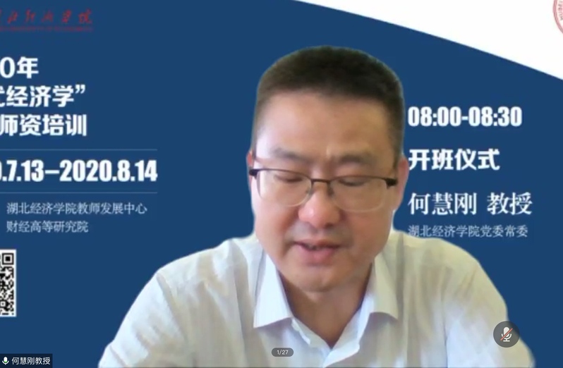 7月13日,2020年“现代经济学”暑期师资培训班线上开班仪式顺利举办,湖北经济学院副校长何慧刚教授,财经高等研究院院长、特聘教授出席开班仪式,仪式由人事处副处长彭芸主持。学校2020年新进经管类教师、部分经管类骨干教师参加。
