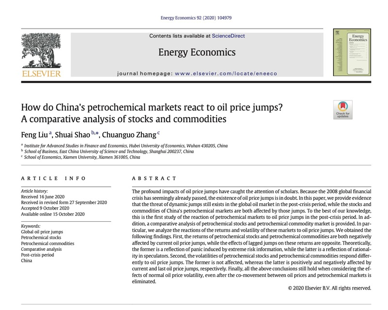 我院教师刘峰博士与湖北经济学院特聘教授邵帅、厦门大学经济学院张传国教授合作论文“How Do China’s Petrochemical Markets React to Oil Price Jumps? A Comparative Analysis of Stocks and Commodities”在能源经济学国际权威期刊Energy Economics (SSCI, JCR一区, IF 5.203)正式在线发表。