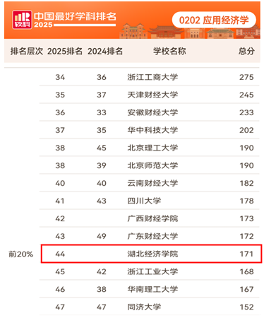 10月15日,高等教育评价专业机构软科正式发布“2025软科中国最好学科排名”。我校应用经济学学科首次上榜,排名第44位,进入全国前20%。全国136所高校上榜,其中湖北省8所,7所为部属高校,我校是唯一一所省属高校。