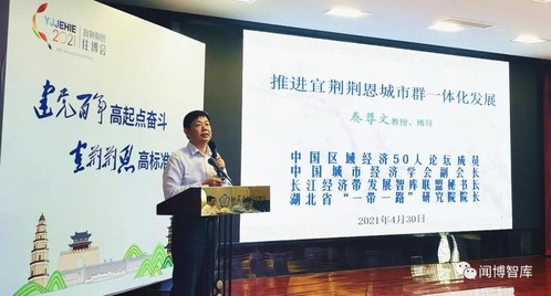 湖北省政府咨询委员、长江经济带高质量发展智库联盟秘书长、长江经济带发展战略研究院执行院长秦尊文教授应邀出席论坛,并发表了《推进宜荆荆恩城市群一体化发展》的主旨演讲,提出要共推城镇化健康发展、合力建设生态文明、促进产业协同发展、推动基础设施互联互通、促进公共服务均等化、拓展开放合作新空间等对策建议,受到与会嘉宾好评。