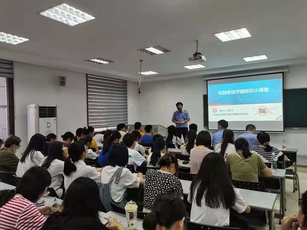 彭所长首先介绍了电信诈骗的概念,即以非法占有为目的,利用手机短信、电话、网络电话、互联网等传播媒介,以虚构现实或隐瞒事实真相的方法,骗取数额较大的公私财务物行为。他结合工作中接触到的各种电信诈骗真实案例,图文并茂地进行讲解,为同学们总结出冒充“公检法”、刷单类、快递购物类、“裸聊”敲诈勒索类等四类常见的校园电信诈骗手段,进而详细分析了被骗原因,如不明真相的恐慌、情绪失控的主张、动机不纯的欲望、迷之自信的张狂等等。彭所长还提出了针对性的防范手段和方法,引起同学们重视并提高自身防范意识,遇到类似情况多加防范,不要轻易给陌生人转账。