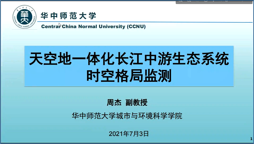 华中师范大学城市与环境科学学院周杰副教授作“天空地一体化长江中游生态系统时空格局监测”的专题报告,重点介绍了生态环境及生态系统遥感监测技术及指标体系研究、湖北省地表水氮、磷污染特征与污染负荷估算、江汉平原农业小流域地表水氮、磷污染调查等方面的研究,并提出了面向“碳中和”的生态系统碳含量估算、长江中游地区精细作物制图与估产等方面的研究设想,系列研究表明主要生态系统的健康发展是长江经济带建设、区域“碳中和”以及可持续发展等国家战略实现的重要保障;丰富对地观测大数据为全方位生态系统监测提供了重要支撑;“碳中和”目标的顺利实现依耐对陆表碳总量及其时空分布的准确估算,厘清“碳源”和碳汇。