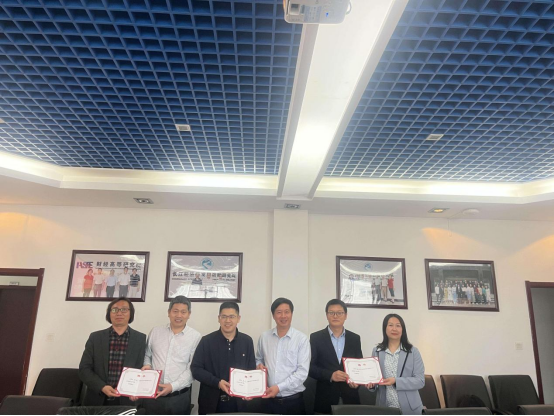 湖北经济学院党委常委许传华(右三)、湖北经济学院学工处副处长郭倩倩(右一)、湖北经济学院研究生处副处长王立俊(左二)为上海金仕达软件科技股份有限公司副总裁吴江(左三)、上海金仕达软件科技股份有限公司总监闫晖、上海金仕达软件科技股份有限公司副总监向捷颁发行业导师聘书