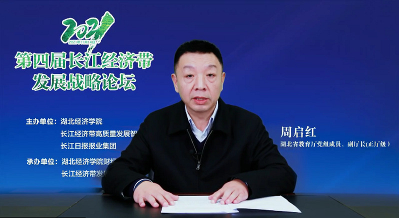 2021年11月14日,第四届长江经济带发展战略论坛在湖北经济学院以线上线下结合的会议方式成功举办,主题为“加快建立生态产品价值实现机制”。会议开幕式由湖北经济学院校长方洁主持,全国政协常委、湖北省政协副主席、民建湖北省委会主委郭跃进,湖北省教育厅党组成员、副厅长周启红(正厅级),湖北省推动长江经济带发展和生态保护领导小组办公室副主任常贤波,湖北经济学院党委书记温兴生,长江日报报业集团党委书记、社长、董事长、总编辑陈光,著名经济学家田国强在大会上致辞。本次会议由湖北经济学院、长江经济带高质量发展智库联盟、长江日报报业集团主办,湖北经济学院财经高等研究院、长江经济带发展战略研究院承办。本次会议由长江网全程直播并在全平台宣传报道,据统计,截止上午会议结束时,全网观看直播峰值达25.6万人。