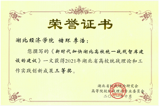 近日,2021年湖北高校统战理论研究会第37次年会召开,经省委统战部、省委高校工委组织相关专家评审,我院储环、李浩撰写的《新时代加快湖北高校统一战线智库建设的建议》一文荣获2021年湖北省高校统战理论和工作实践创新成果三等奖。