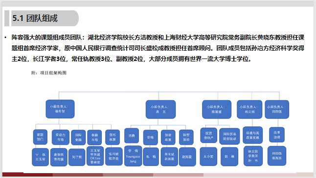 该项目团队阵容强大,湖北经济学院校长方洁教授(兼武汉市政协常委,曾任武汉市政府金融办主任,武汉市金融工作局局长)和上海财经大学经济学院常务副院长黄晓东教授(曾任美联储堪萨斯分行高级经济学家、美联储费城分行经济顾问)任首席经济学家,原中国人民银行调查统计司司长盛松成教授担任首席顾问。